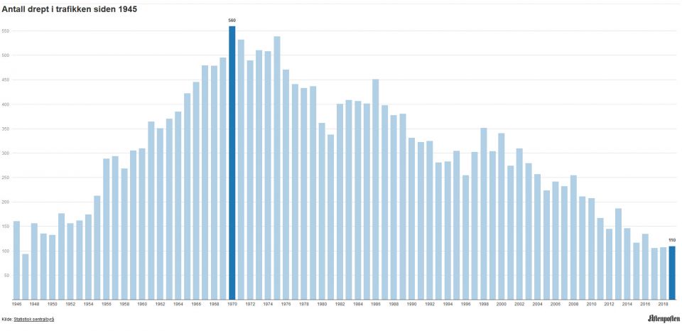 Η σημαντική μείωση των τροχαίων, όμως, δεν ισχύει μόνο για το Όσλο. Η Νορβηγία είναι επίσης από τις ασφαλέστερες χώρες στην Ευρώπη όσον αφορά τους θανάτους από τροχαία ατυχήματα. Ο αριθμός των θανάτων από τροχαία ατυχήματα μειώθηκε σχεδόν κατά το ήμισυ κατά την τελευταία δεκαετία, όταν το 2010 είχαν χάσει τη ζωής τους 210 άνθρωποι, ενώ το 2019 υπήρχαν μόνο 110 νεκροί από τροχαία.