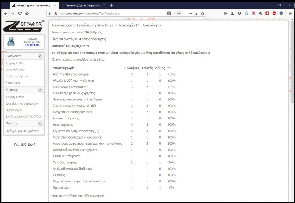 Στο τέλος της αξιολόγησης μπορείτε να δείτε το οδηγητικό σας αποτύπωμα όπως και τα ποσοστά επιτυχίας ανά υποκατηγορία..!