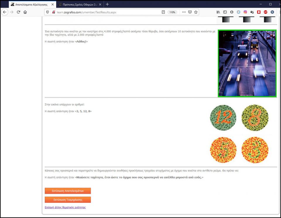 Επίσης μπορείτε να δείτε όλες τις ερωτήσεις και ποιες απαντήσατε λάθος, όπως επίσης να εκτυπώσετε τα αποτελέσματα και την τεκμηρίωση των λάθος ή σωστών απαντήσεων.
